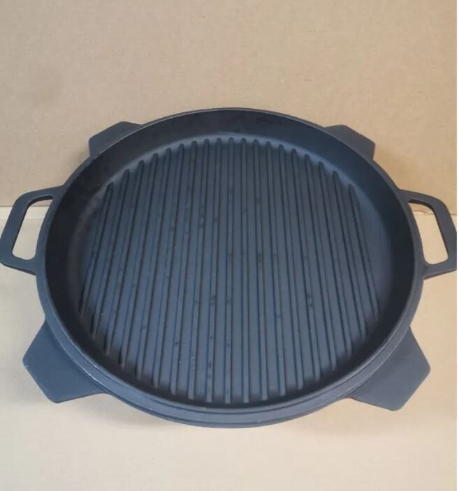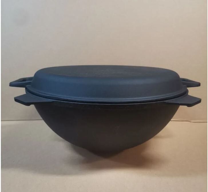 Крышка в комплекте выполнена в виде чугунной сковороды-гриль с рифлёной поверхностью — её можно использовать отдельно для жарки стейков, овощей и рыбы. Благодаря высокой теплоёмкости чугун не деформируется, устойчив к высоким температурам и подходит для костра, печи, мангала и газовой плиты.